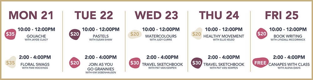 Stephanie’s has curated an eclectic program of arty and fun workshops for you during Jumpers and Jazz. All the presenters are interesting local people who have a special skill to share with you. We have covered music, art, food and flowers. Browse the schedule, and find a class and date, and book in to learn something new.